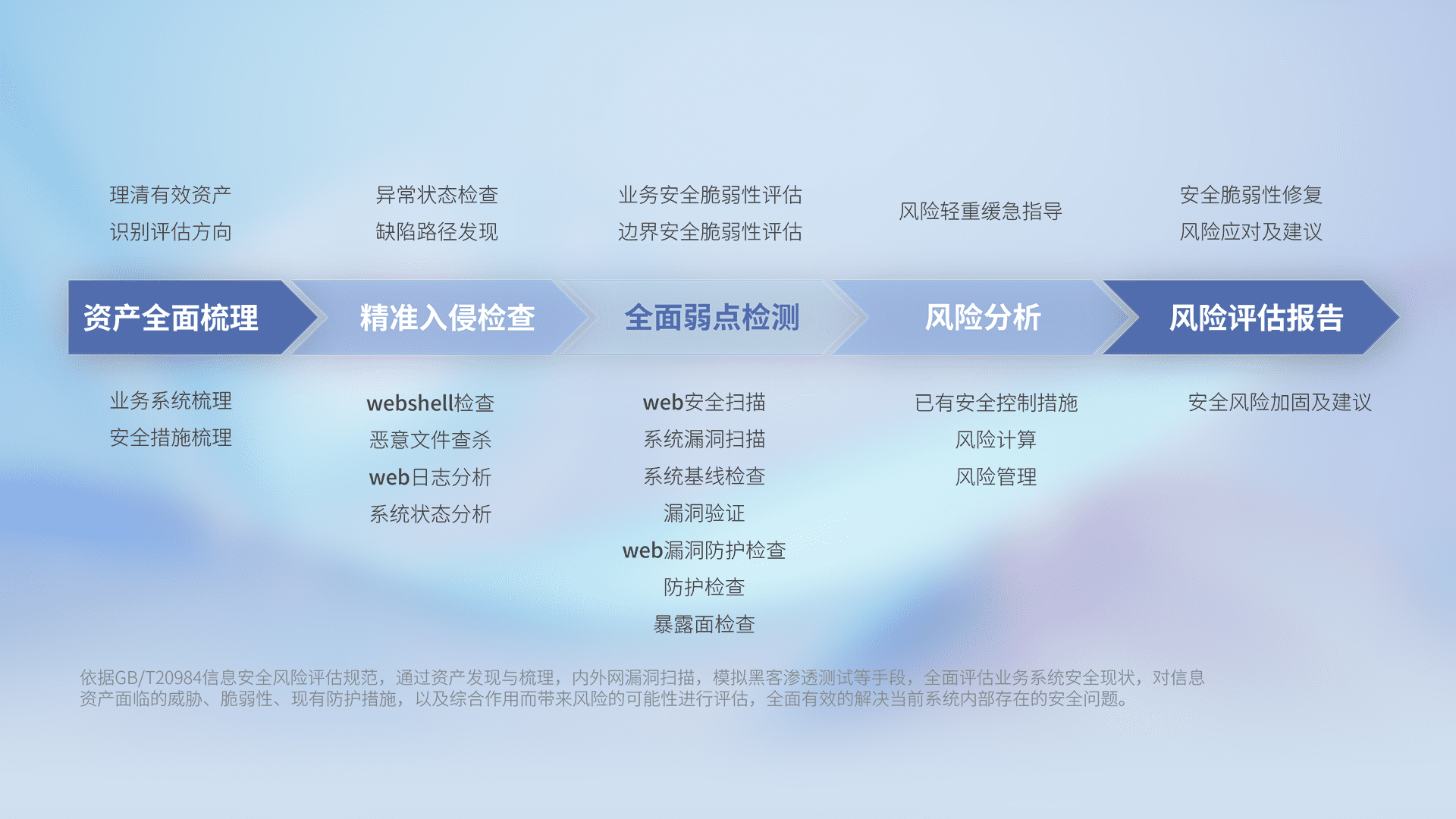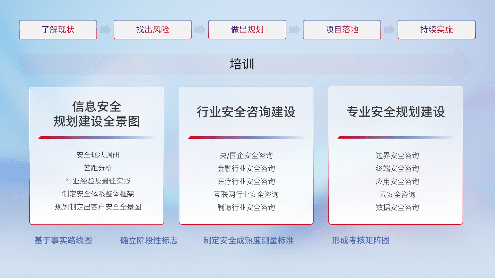 针对客户行业特性,,,,以专业的安全服务+多厂商联合解决方案提供专属的一站式安全管理服务,,,,帮助客户全面感知网络空间威胁,,,,基于识别、、检测、、、分析、、、防护、、、、监测、、、、响应的服务理论模型,,,从方案咨询、、集成交付、、、评估验证、、优化加固、、、、运维运营,,,,致力于为客户提供完整的闭环管理式安全服务。。。以实战经验为客户打造高抵御风险的安全体系,,,帮助客户发现威胁、、对抗威胁、、、处置威胁,,,,不断积累安全对抗能力,,,,持续保障数字化安全。。